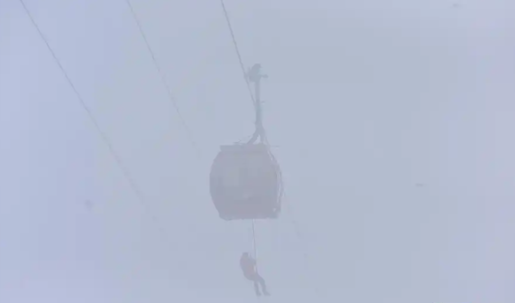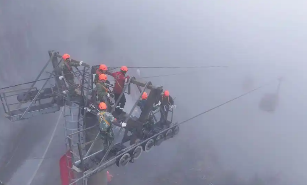 攜帶救援設(shè)備的數(shù)名專業(yè)索道救護(hù)人員迅速行動(dòng),攀上支架,在濃霧中以最快的時(shí)間抵達(dá)被困轎廂。他們將游客救助至安全地點(diǎn),地面等候的醫(yī)護(hù)人員則第一時(shí)間對(duì)游客進(jìn)行救護(hù)和安撫工作。