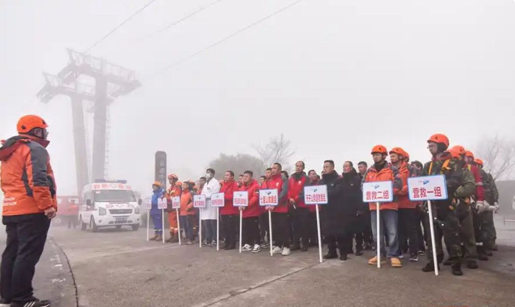 演習(xí)正式開始,運(yùn)行中的天門山索道突然停止,模擬轎廂中的乘客被困。今日山頂飄雪,演習(xí)現(xiàn)場(chǎng)大霧彌漫,能見度極低,這為救援行動(dòng)增添了額外的難度和緊迫感。雖然現(xiàn)場(chǎng)氣溫接近0°,但救援人員已經(jīng)大汗淋漓。