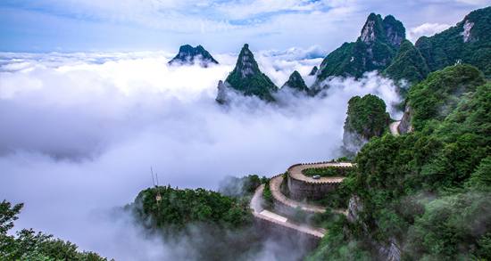 天門(mén)山盤(pán)山公路全長(zhǎng) 10.77公里,高差 1300多米,共有99道彎,因直達(dá)天門(mén)洞而得名“通天大道”。大道兩側(cè)空谷幽深,借山勢(shì)層層疊起,如巨龍盤(pán)旋,直通天際,被譽(yù)稱(chēng)為 “天下第一公路奇觀(guān)”。